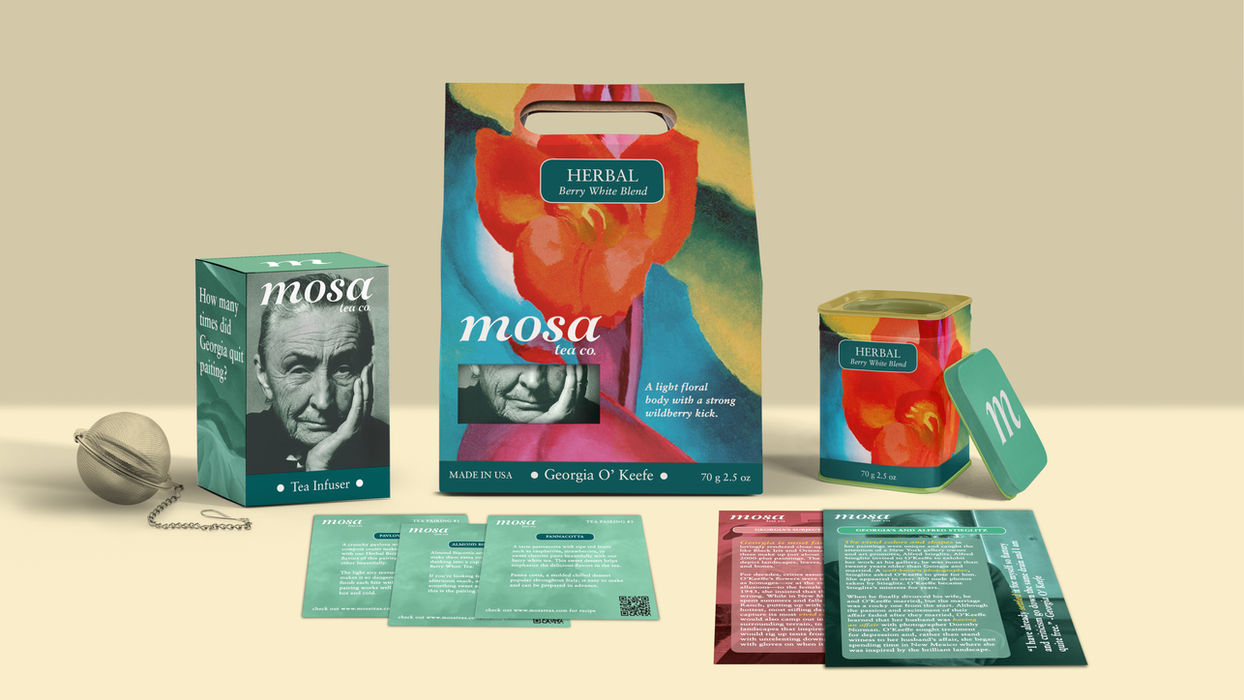 Mosa Tea Co is a boutique tea kit brand that features a spherical tea infuser, a tea canister, informational cards, and suggested tea pairings. The brand comprises five distinct packages, each dedicated to a renowned female artist.